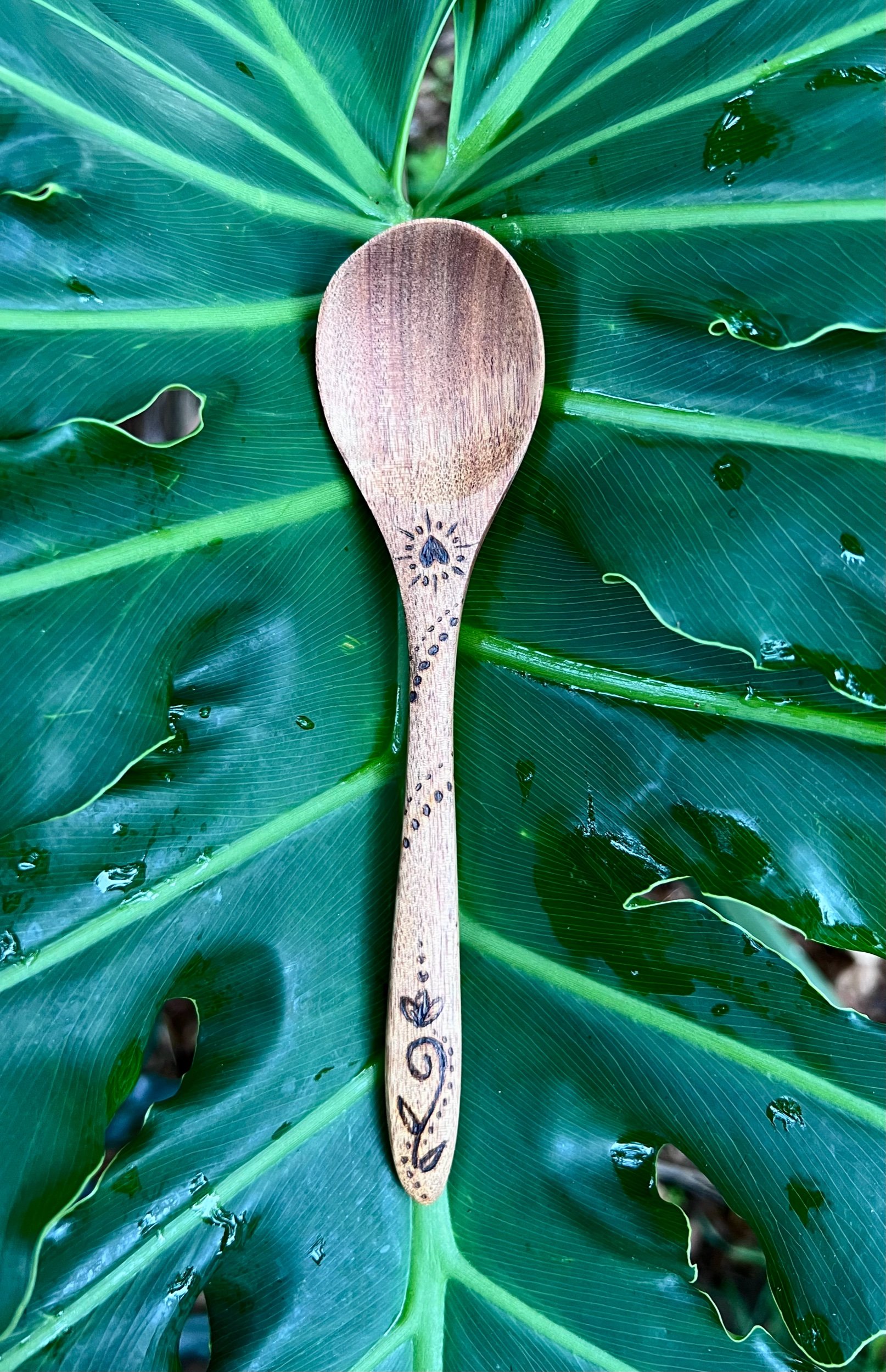 This spoon is a beautiful hand burned addition to your kitchen. Great for people with sensory issues or children, wooden spoons can offer a unique and enjoyable option instead of a metal utensil. Hand wash only, this useable art can make the little moments special.
